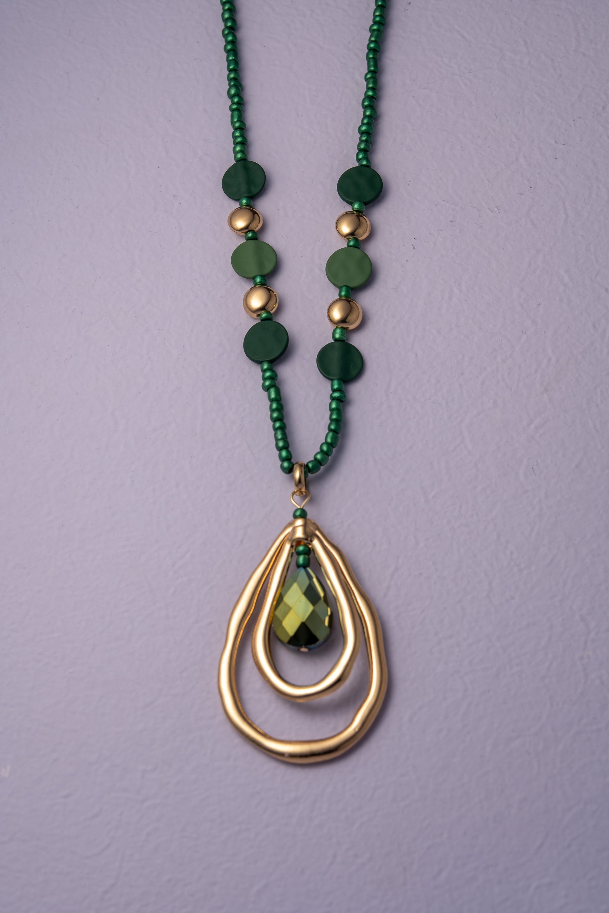 Κολιέ με πράσινες χάντρες και παντατίφ σε χρυσό χρώμα με πράσινη πέτρα.