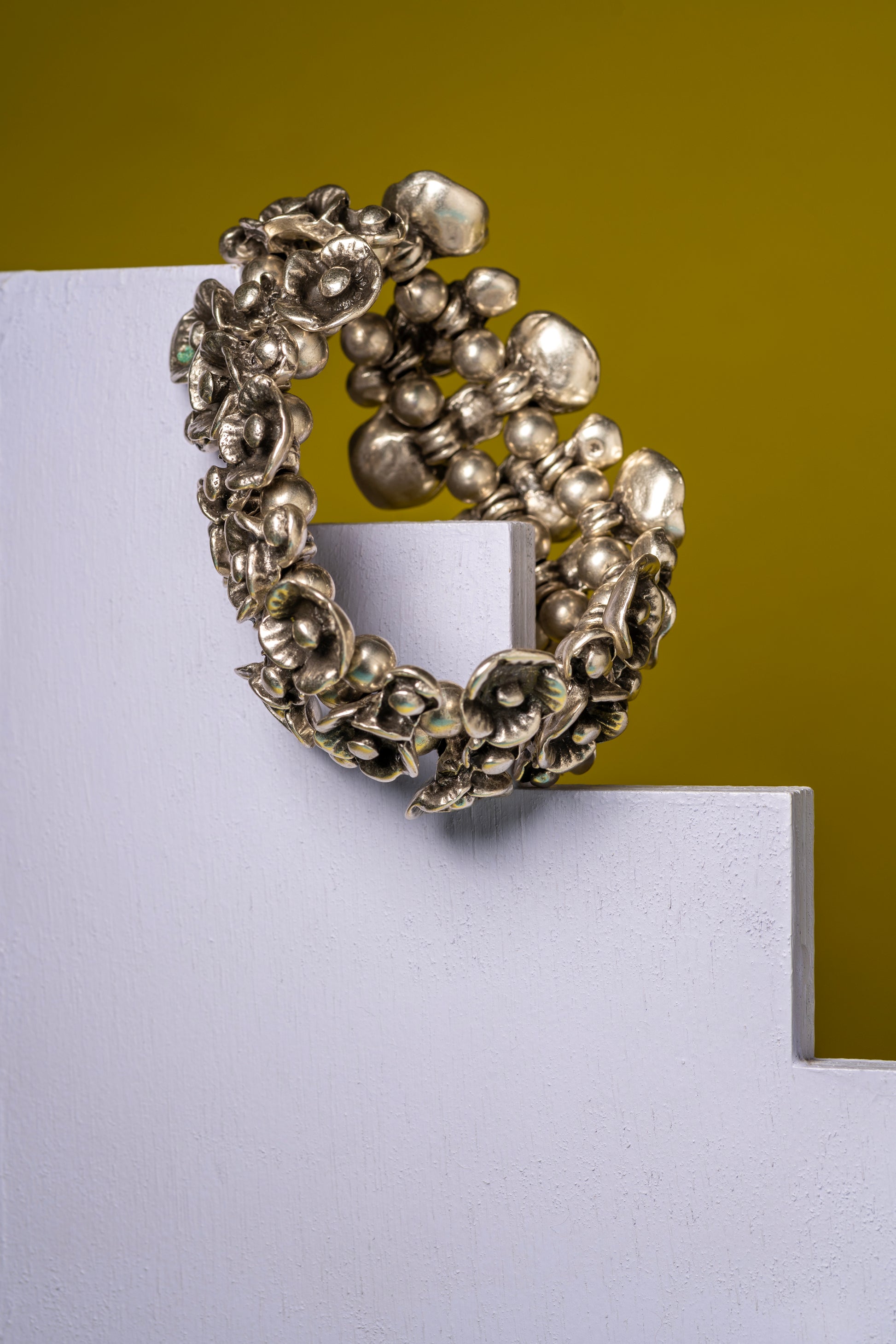 Χειροποίητο εντυπωσιακό βραχιόλι με λουλούδια σε ασημί ματ χρώμα (4 cm)